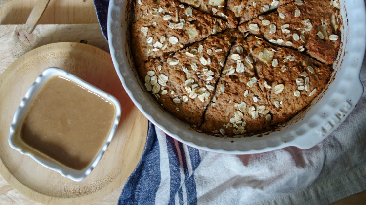 3.-Añade la manzana y vuelve a mezclar con movimientos envolventes, vierte en una fuente redonda apta para horno lubricada con aceite de oliva, corta en 8 trozos, decora con avena por encima y hornea 20 minutos.